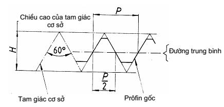 3.1. Profin gốc (cơ sở) (basic profile): Profin lý thuyết của ren vít trong mặt phẳng dọc trục được xác định bởi các kích thước và góc lý thuyết dùng chung cho ren ngoài và ren trong. Hình 6 giới thiệu một ví dụ về profin gốc của ren vít hệ mét ISO.