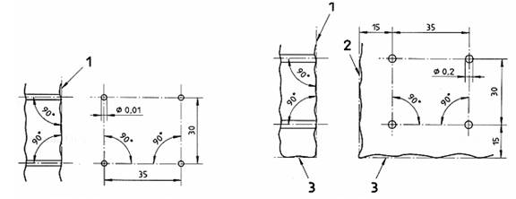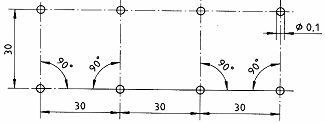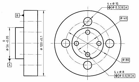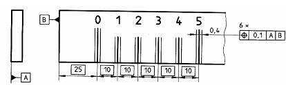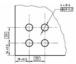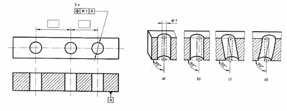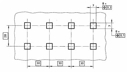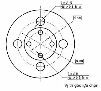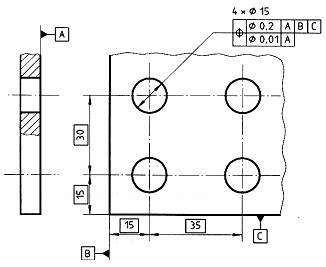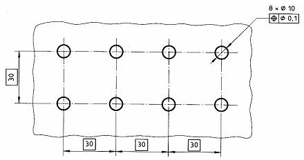 Đường trục thực của mỗi lỗ phải nằm trong một miền dung sai hình trụ có đường kính 0,1 mm; đường trục của miền dung sai hình trụ được cố định bởi các kích thước chính xác lý thuyết.
