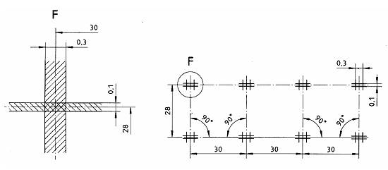 - được đo theo hướng kích thước chính xác lý thuyết 30; bề mặt trung tuyến thực của lỗ nằm trong một miền dung sai có mặt cắt ngang chữ nhật 0,3 x chiều dài thực của yếu tố;