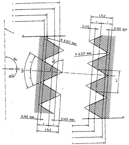 Profin phải có góc 55 o. Phải đo hình dạng và chiều cao ren vuông góc với bề mặt côn (xem Hình 1).