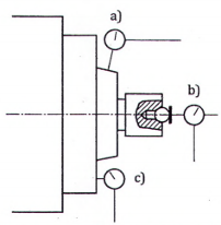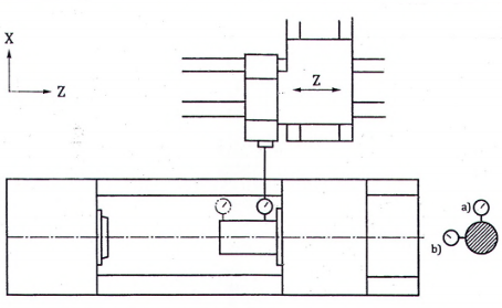 | Kiểm sai số độ song song của lòng côn bên trong của nòng ụ sau với chuyển động trục Z của bàn xe dao: a) trong mặt phẳng ZX; b) trong mặt phẳng YZ. | ||