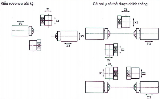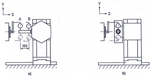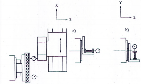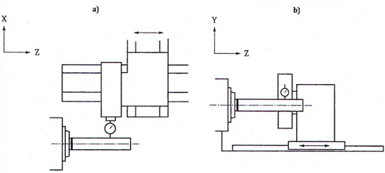| Kiểm sự cách đều của các tâm của trục chính mang phôi và ụ sau với trục Z: a) trong mặt phẳng ZX; b) trong mặt phẳng YZ. | ||