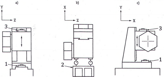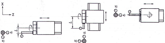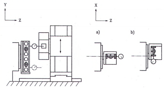 | Kiểm sai số độ đồng trục và sự giao nhau của đường tâm trục chính mang dụng cụ cắt với đường tâm trục chính mang phôi: a) độ đồng trục khi trục chính mang dụng cụ cắt song song với trục chính mang phôi trong mặt phẳng ZX và YZ; b) sự giao nhau khi trục chính mang dụng cụ cắt trực giao với trục chính mang phối trong mặt phẳng YZ. | ||
