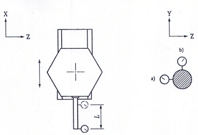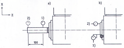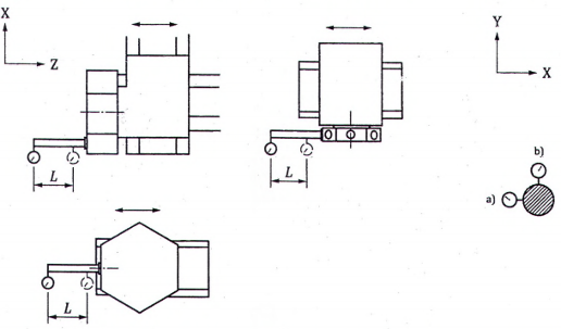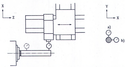 | Xem và tham chiếu 10.1.4.1 và 10.1.4.3, ISO 230-1:2012 Lắp trục kiểm vào lỗ gá dụng cụ cắt của rơvonve và lắp đồng hồ so vào phần cố định của máy sao cho đầu đo của đồng hồ so chạm vào trục kiểm trong mặt phẳng ZX đối với a) và mặt phẳng XY đối với b). Phép kiểm được lặp lại cho tất cả các lỗ gá của rơvonve. Rơvonve nên ở vị trí hướng về hoặc gần trục chính nhất có thể. Nếu phương pháp định vị dụng cụ cắt đòi hỏi một mặt bích thì thiết kế của trục kiểm nên sao chép giống nó. Sai số độ song song sẽ được báo cáo là độ chênh lệch của các số đọc trên chiều dài đo. | ||