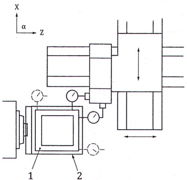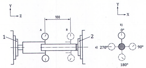 | Phương tiện đo Trục kiểm, các đầu dò không tiếp xúc và phương tiện đo góc hoặc hai khối cầu chính xác được đặt hơi lệch tâm với đường trung bình của trục chính và các đầu dò không tiếp xúc | ||||||||||