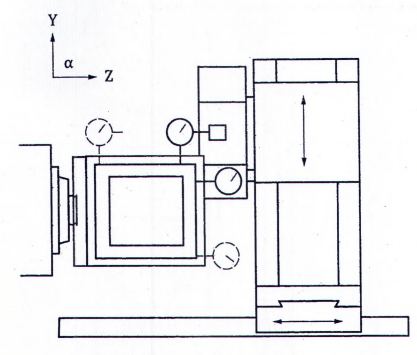 | Xem Đưa trục kiểm vào trong trục chính mang phôi song song với mặt phẳng ZX. Lắp đồng hồ so vào rơvonve. Đối với a): Chạm trục kiểm vào đầu đo của đồng hồ so ở một vị trí cách trục tâm quay B’ khoảng 300 mm. Xoay trục B’ tới góc +30° (+60°) và dịch chuyển rơvonve trong mặt phẳng ZX cho đến khi đồng hồ so chạm lại vào cùng một điểm trên trục kiểm và ghi lại số đọc đầu tiên. Xoay trục B’ về 0° và dịch chuyển rơvonve trong mặt phẳng ZX cho đến khi đồng hồ so chạm lại vào cùng điểm đó trên trục kiểm và ghi lại số đọc thứ hai. Xoay trục B’ tới góc -30° (-60°) và dịch chuyển rơvonve trong mặt phẳng ZX cho đến khi đồng hồ so chạm lại vào cùng điểm trên trục kiểm và ghi lại số đọc thứ ba. Đối với b): Chạm trục kiểm vào đầu đo của đồng hồ so ở một vị trí cách trục tâm quay B khoảng 300 mm. Xoay trục B tới góc +30° (+60°) và dịch chuyển rơvonve trong mặt phẳng ZX cho đến khi đồng hồ so chạm lại vào cùng một điểm trên trục kiểm và ghi lại số đọc đầu tiên. Xoay trục B về 0° và dịch chuyển rơvonve trong mặt phẳng ZX cho đến khi đồng hồ so chạm lại vào cùng điểm đó trên trục kiểm và ghi lại số đọc thứ hai. Xoay trục B tới góc -30° (-60°) và dịch chuyển rơvonve trong mặt phẳng ZX cho đến khi đồng hồ so chạm lại vào cùng điểm trên trục kiểm và ghi lại số đọc thứ ba. Độ nhất quán về một khoảng cách là độ chênh lệch lớn nhất của ba số đọc của đồng hồ so. Lặp lại phép đo này ba lần. Độ nhất quán về một khoảng cách sẽ được báo cáo là giá trị trung bình của các phép đo này. | ||