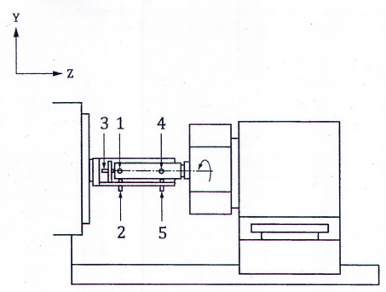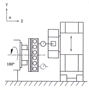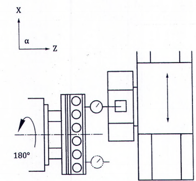| Xem và tham chiếu 10.1.4.1, ISO 230-1:2012 Với nòng ụ sau ở vị trí được ấn thụt vào, đưa trục kiểm vào trong nòng. Cố định đồng hồ so vào rơvonve và chạm vào trục kiểm với đầu đo đồng hồ so gần với đầu mút ụ sau nhất có thể. Di chuyển bàn xe dao (trục Z) trên chiều dài đo và ghi lại các giá trị đo. Lặp lại quy trình đo này với trục kiểm được chèn vào lại ở vị trí đã được xoay đi góc 180°. Sai số độ song song sẽ được báo cáo là giá trị trung bình của hai sai lệch, trước và sau khi xoay trục kiểm 180°, chia cho khoảng cách giữa hai điểm đo. | ||