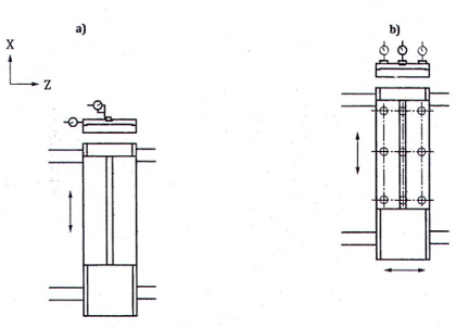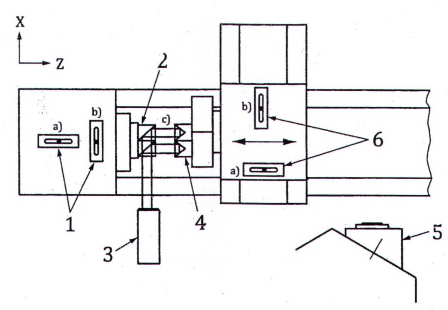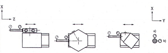 | Kiểm rơvonve tịnh tiến a) Sai số độ song song của rãnh chuẩn hoặc mặt bên chuẩn của bàn trượt ngang với chuyển động trục X. b) Sai số độ song song của bề mặt lắp dụng cụ cắt của bàn trượt ngang và mặt phẳng ZX. CHÚ THÍCH: Chỉ áp dụng cho rơvonve có dạng cấu hình kiểu d) (xem Hình 3). | ||