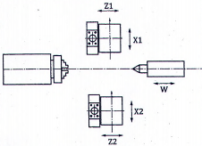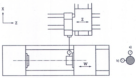 | Xem Cố định hai bộ đồng hồ so/các giá đỡ vào rơvonve và chạm các đầu đo của đồng hồ so vào nòng của ụ sau. Di chuyển bàn xe dao (trục Z) và ụ sau (trục W) cùng nhau và ghi lại các số đọc của đồng hồ so. Các phép đo phải được thực hiện ở ít nhất 5 vị trí cách đều nhau dọc theo hành trình theo cả hai chiều của chuyển động. Độ chênh lệch giữa các số đọc lớn nhất và nhỏ nhất là độ nhất quán của một khoảng cách. Nếu ụ sau được điều khiển bằng tay, phải khóa ụ sau trước khi ghi giá trị các phép đo. Cần cẩn thận để bảo đảm các số đọc được lấy tại cùng một điểm trên nòng của ụ sau. Nếu gặp khó khăn khi di chuyển cả hai trục cùng nhau, thì nên di chuyển bàn xe dao hướng tới ụ phôi tới vị trí đo đầu tiên. Sau đó, di chuyển ụ sau cho đến khi đồng hồ so chạm tới vị trí đo. Đối với dịch chuyển theo hướng ngược lại, trình tự của các dịch chuyển được đảo ngược lại. | ||