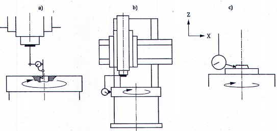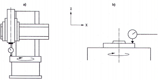 | Xem và tham chiếu 12.4.1, ISO 230-1:2012 Một đồng hồ so được cố định trên trục chính mang phôi và tiếp xúc với mặt đáy của bộ kẹp dụng cụ cắt. Trục chính mang phôi phải được xoay và đồng hồ so được dịch chuyển để tiếp xúc với mặt của bộ kẹp dụng cụ cắt trên đường kính lớn nhất có thể. Nếu máy được trang bị rơvonve dụng cụ cắt, phép kiểm này phải được thực hiện lặp lại cho từng mặt gá lắp dao của rơvonve này. | ||