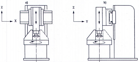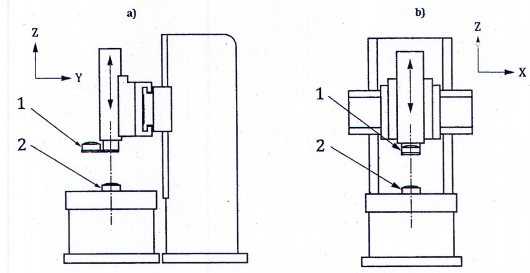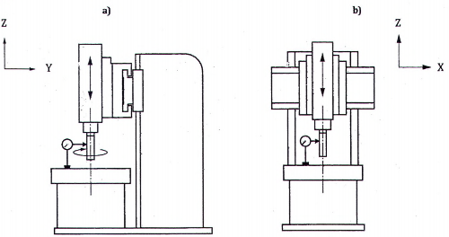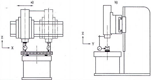 | Kiểm độ song song trục quay của trục chính mang dụng cụ cắt C1 với chuyển động của đầu trượt bộ kẹp dụng cụ cắt (trục Z): a) trong mặt phẳng YZ [E A( 0 Z)(C1) ]; b) trong mặt phẳng ZX [E B(0Z)(C1) ]. | ||