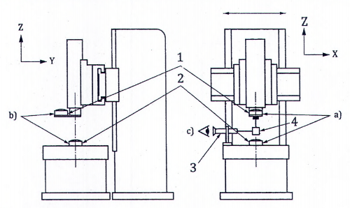 | Xem và tham chiếu 12.5.3, ISO 230-1:2012 Gắn đồng hồ so vào bàn máy (trục chính mang phôi) và đưa trục kiểm vào trong trục chính mang dụng cụ cắt được dẫn động công suất. Đặt cảm biến độ dịch chuyển gần với vị trí a) nhất có thể, xoay trục chính mang dụng cụ cắt và ghi lại số đọc. Lặp lại cùng quy trình này ở vị trí b). Nếu máy có nhiều trục chính mang dụng cụ cắt, tiến hành các phép kiểm này cho từng trục (xem thêm phép kiểm AR2). | ||