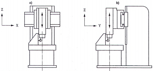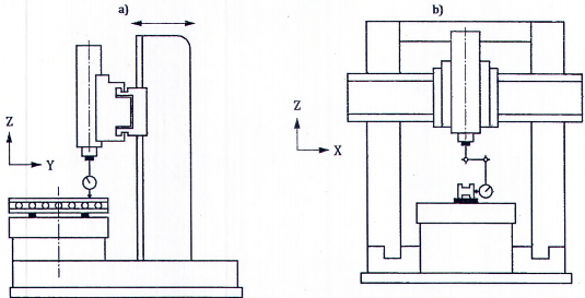 | Kiểm độ thẳng chuyển động của khung (loại khung) hoặc bàn máy mang phôi di động (loại cổng) theo phương trục Y: a) trong mặt phẳng thẳng đứng YZ (E ZY ); b) trong mặt phẳng nằm ngang XY (E XY ). | ||