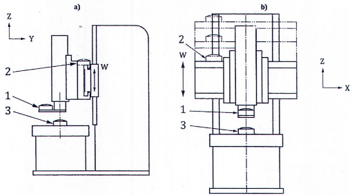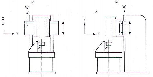 | Kiểm độ song song chuyển động trục W của xà ngang với trục quay của trục chính hoặc bàn máy mang phôi: a) trong mặt phẳng ZX [E B(0C)W ]; b) trong mặt phẳng YZ [E A(0C)W ]. | ||