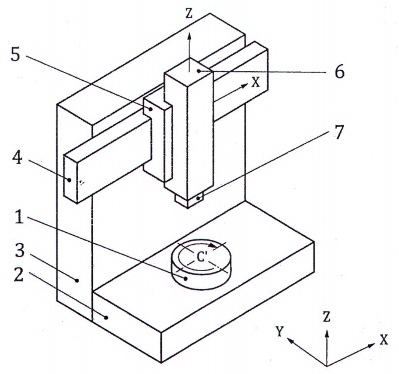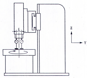| Xem và tham chiếu 8.2 và 12.1.2.2, ISO 230-1:2012 Đối với các máy loại khung, xà ngang được khóa ở vị trí nằm giữa, đầu trượt bộ kẹp dụng cụ cắt ở vị trí đo. Thước thẳng nên được đặt trên bàn máy mang phôi song song với trục Y. Đồng hồ so, giao thoa kế, bia hoặc kính hiển vi dùng cho dây căng phải được lắp trên ụ xà ngang gần với vị trí của dụng cụ cắt. Đường đo nên gàn với trục quay của bàn máy mang phôi. Cách khác, nếu thước thẳng không được chỉnh thẳng bằng cơ học, các kết quả có thể được đánh giá theo 3.4.8, ISO 230-1:2012. | ||