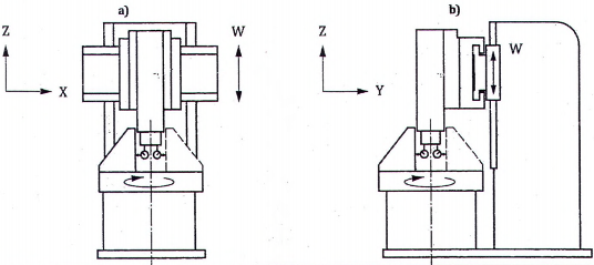 | Kiểm sai số góc của xà ngang trong chuyển động trục W của nó. Tùy chọn khác, kiểm chuyển động quay của xà ngang quanh trục W (nếu lắc xoay có liên quan): a) trong mặt phẳng thẳng đứng YZ (E AW ); b) trong mặt phẳng thẳng đứng ZX (E BW ); c) trong mặt phẳng XY, E CW (lắc xoay). | ||