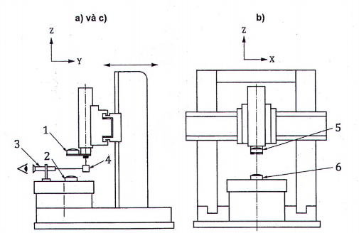 | Kiểm độ đồng trục của đường tâm trục chính mang dụng cụ cắt với trục quay của trục chính mang phôi: a) trong mặt phẳng YZ [E Y(0C)(C1) và E A(0C)(C1) ]; b) trong mặt phẳng ZX [E X(0C)(C1) và E B (0C)(C1) ]. | ||