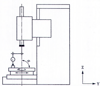 | Xem và tham chiếu 10.3.3, ISO 230-1:2012 Đặt một căn mẫu trên một mép của bàn máy, cách xa trục quay theo phương Y; cố định đồng hồ so vào bộ kẹp dụng cụ cắt; đưa đầu đo vào tiếp xúc với căn mẫu và chỉnh đồng hồ so về không. Xoay bàn máy góc 180° và dịch chuyển trục Y cho đến khi đầu đo chạm lại vào căn mẫu. Số đọc của đồng hồ so chia cho khoảng dịch chuyển Y là sai số sẽ được báo cáo. Giá trị góc α, nhỏ hơn, bằng hoặc lớn hơn 90° phải được ghi lại. | ||