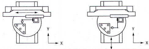 | Xem và tham chiếu 10.1.4, ISO 230-1:2012 Một trục kiểm được lắp trên trục chính mang dụng cụ cắt. Nếu có thể, trục chính mang phôi cần được kẹp lại. a) Đồng hồ so được gắn vào trục chính mang phôi với đầu đo chạm vào trục kiểm theo phương Y. Hướng trung bình của trục kiểm được xác định bằng cách xoay trục chính mang dụng cụ cắt giữa hai số đọc cực trị của cảm biến độ dịch chuyển. Cảm biến độ dịch chuyển được chỉnh về không (0) ở hướng trung bình này. Sau đó đầu trượt bộ kẹp dụng cụ được dịch chuyển đến đầu mút khác của hành trình đo và ghi lại số đọc của cảm biến độ dịch chuyển. b) Đồng hồ so được gắn vào trục chính mang phôi với đầu đo chạm vào trục kiểm theo phương X. Hướng trung bình của trục kiểm được xác định bằng cách xoay trục, chính mang dụng cụ cắt giữa hai số đọc cực trị của cảm biến độ dịch chuyển. Cảm biến độ dịch chuyển được chỉnh về không (0) ở hướng trung bình này. Sau đó đầu trượt bộ kẹp dụng cụ được dịch chuyển đến đầu mút khác của hành trình đo và ghi lại số đọc của cảm biến độ dịch chuyển. Sai lệch độ song song là độ chênh lệch của trung bình hai phép đo, chỉ lấy ở các điểm đầu mút (ở 0° và 180°), chia cho khoảng cách hành trình này. Cách khác, áp dụng độ dốc đường thẳng tham chiếu của trung bình hai phép đo (ở 0° và 180°). CHÚ THÍCH: Các phép kiểm hơn nữa để kiểm độ chính xác của các trục quay được nêu trong Phụ lục A. | ||