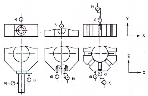 | Xem và tham chiếu ISO 230-1:2012 Định vị trí đầu đo đồng hồ so a), b) và c) sao cho chúng tiếp xúc với các lỗ hoặc rãnh chuẩn của rơvonve. Ghi lại vị trí trục tâm của rơvonve. Ghi lại các số đọc của đồng hồ so. Kéo rơvonve ra khỏi đồng hồ so, phân độ rovonve đến vị trí kế tiếp và định lại vị trí trục tâm của rơvonve. Ghi lại các số đọc của đồng hồ so. Nếu sử dụng mặt chuẩn của rơvonve thì đồng hồ so cần được sử dụng ở vị trí d). Lặp lại phép kiểm này ba lần đối với từng vị trí của rơvonve; khi đó các số đọc ở từng vị trí được tính trung bình để giảm thiểu ảnh hưởng của khả năng lặp lại của rơvonve. Độ chênh lệch lớn nhất của tất cả các số đọc của đồng hồ so đã tính trung bình là độ chính xác của việc phân độ rơvonve. Khả năng lặp lại của việc phân độ rơvonve và khả năng lặp lại của việc gá lắp trục kiểm (nếu dùng) có thể ảnh hưởng đến các số đọc. | ||