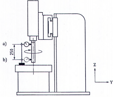 | Kiểm độ đảo của mặt côn trong của trục chính mang dụng cụ cắt: a) ở đầu mút trục chính mang dụng cụ cắt; b) ở vị trí cách đầu mút trục chính mang dụng cụ cắt 250. | ||