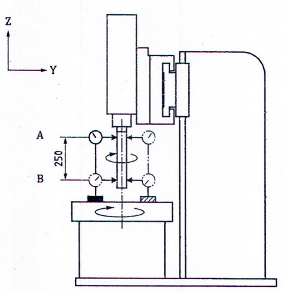 | Xem và tham chiếu 10.2, ISO 230-1:2012 Gắn các đồng hồ so/giá đỡ vào trục chính mang phôi và trục kiểm vào trục chính mang dụng cụ. Xoay trục chính mang phôi để đồng hồ so nằm trong mặt phẳng ZX và đầu đo tiếp xúc với trục kiểm ở vị trí A và lấy số đọc đầu tiên. Xoay cả hai trục chính với các lượng gia tăng 90° và lấy các số đọc ở từng lượng gia tăng đó. Lặp lại phép đo cho vị trí B. Độ chênh lệch của hai số đọc lấy ở 0° và 180° chia cho 2 thể hiện các độ lệch giữa hai trục quay ở vị trí A và B trong mặt phẳng ZX. Độ chênh lệch của hai số đọc lấy ở 90° và 270° chia cho 2 thể hiện các độ lệch giữa hai trục quay ở vị trí A và B trong mặt phẳng YZ. Khi dụng cụ laze chỉnh thẳng được sử dụng, xoay cả hai trục chính và ghi lại các số đọc ở số lượng các vị trí quay mà hệ thống chỉnh thẳng laze yêu cầu (như 0°, 90°, 180° và 270°). Sai số độ đồng trục chứa cả sai số đô lệch và độ song song. Sai số độ lệch là đô lệch ở vị trí B. Sai số độ song song là độ chênh lệch giữa các độ lệch ở vị trí A và B, chia cho khoảng cách giữa các điểm A và B (250 mm). CHÚ THÍCH: Các phép kiểm hơn nữa để kiểm độ chính xác của các trục quay được nêu trong Phụ lục A. | ||