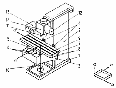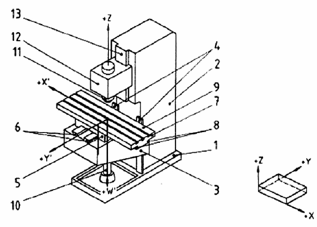 | Quan sát và tham chiếu 5.5.1.2.1 và 5.5.1.2.4.2 của TCVN 7011-1 Bàn máy (trục X), bàn trượt (trục Y) và đường hướng của ụ trục chính (trục Z) và giá đỡ bàn (trục W) phải được khóa. | ||