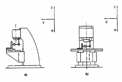 | Kiểm độ thẳng chuyển động thẳng đứng của giá đỡ bàn (trục W): a) Trong mặt phẳng thẳng đứng đối xứng của máy (mặt phẳng YZ); Trong mặt phẳng vuông góc với mặt phẳng thẳng đứng đối xứng của máy (mặt phẳng ZX). | ||