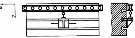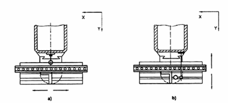 | Quan sát và tham chiếu 5.5.2.2.4 của TCVN 7011-1 Giá đỡ bàn (trục W) phải được khóa lại. a) Thước thẳng phải được đặt song song đối với chuyển động dọc của bàn máy (trục X), rồi đặt ke vuông áp vào thước thẳng. Bàn máy phải được khóa ở vị trí giữa. Phép kiểm này cũng có thể được kiểm không có thước thẳng. Chỉnh cạnh dài của ke vuông song song với trục X; b) Phải kiểm chuyển động ngang của bàn trượt (trục Y). Nếu trục chính được khóa, đồng hồ so có thể được lắp trên trục chính. Nếu trục chính không được khóa, đồng hồ so phải đặt trên một bộ phận cố định của máy. | ||