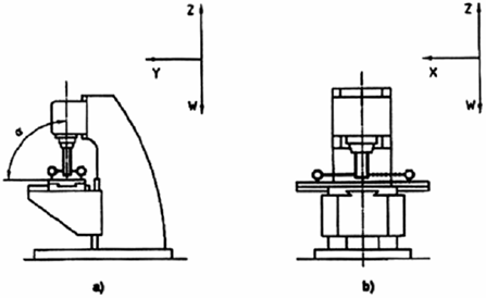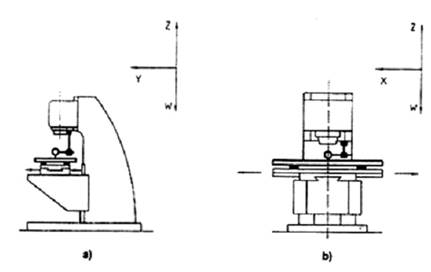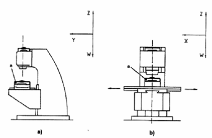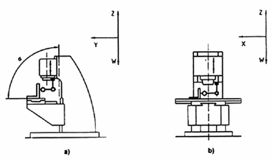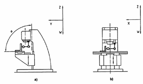 | Kiểm độ vuông góc giữa bề mặt bàn máy và chuyển động thẳng đứng của giá đỡ bàn (trục W) (trong ba vị trí: vị trí giữa và hai vị trí gần mép biên của hành trình): a) Trong mặt phẳng thẳng đứng đối xứng của máy (mặt phẳng YZ); b) Trong mặt phẳng vuông góc với mặt phẳng thẳng đứng đối xứng của máy (mặt phẳng ZX). | ||