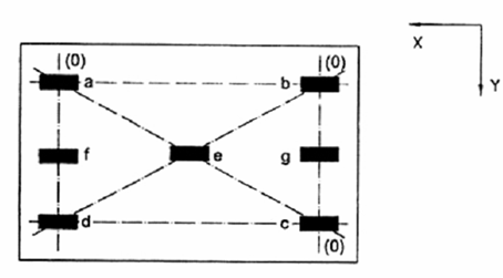 | Quan sát và tham chiếu 5.3.2.2 và 5.3.2.3 của TCVN 7011-1 Bàn máy (trục X) và bàn trượt (trục Y) phải được đặt ở vị trí giữa, không được khóa bàn máy nhưng phải khóa bàn trượt và giá đỡ bàn. CHÚ THÍCH: Các chữ cái chuẩn trên sơ đồ phù hợp với các chữ cái sử dụng trên Hình 41 của TCVN 7011-1. | ||