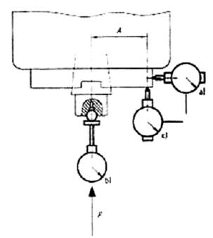 | Quan sát và tham chiếu của TCVN 7011-1 a) 5.6.1.2.2 b) 5.6.2.2.1 và 5.6.2.2.2 Một lực F do nhà cung cấp/nhà chế tạo qui định được ép vào thân máy đối với phép kiểm b) và phép kiểm c). c) 5.6.3.2 Khoảng cách A của đồng hồ so c) tính từ đường tâm đầu trục chính phải càng lớn càng tốt. | ||