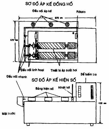 A.2.2. Áp kế − Dùng hệ thống đo áp suất loại lò xo kiểu Bourdon như mô tả trong A.1.2 hoặc thiết bị chuyển đổi áp suất và bộ phận hiện số. Hệ thống này phải lắp cách xa với thiết bị áp suất hơi và dùng các khớp nối nhanh để ghép các phần đầu cuối.