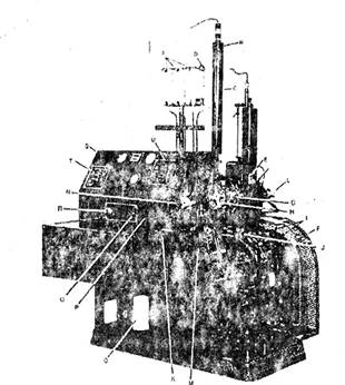 | A - Các bình nhiên liệu B - Bộ phận sấy không khí C - Bộ phận giảm thanh cho không khí nạp D - Buret đo tốc độ chảy của nhiên liệu E - Cảm biến cháy F - Lưới an toàn G - Tay quay điều chỉnh tỷ số nén H - Tay quay khóa chốt điều chỉnh tỷ số nén I - Các cảm biến bánh đà J - Lỗ để đổ dầu hộp khuỷu K - Rơle an toàn kiểu solenoit của bơm phun | L - Cụm vòi phun M - Bơm phun nhiên liệu N - Van chọn nhiên liệu O - Lọc dầu P - Núm vặn kiểm soát việc hâm nóng dầu bôi trơn trong hộp khuỷu Q - Công tắc điều khiển việc sấy không khí R - Công tắc tắt - mở máy S - Bảng điều khiển T - Bảng điều khiển nhiệt độ không khí nạp U - Cặp Đồng hồ xê tan điện tử |