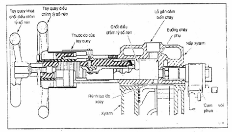 B.3.3.6 Cụm tay quay - Cụm tay quay là một phần gắn liền của cụm nắp xylanh và bao gồm chốt điều chỉnh tỷ số nén được lắp khít trong lỗ của buồng cháy trước, nó được vặn vào hay vặn ra đầu xylanh bằng tay quay để làm thay đổi tỷ số nén. Để ngăn ngừa việc rò rỉ khí cháy, chốt này, không có đệm kín hoặc séc măng, được điều chỉnh bằng tay quay khóa nối với bu lông, bu lông này tác dụng một áp lực lên đĩa đệm hình hoa thị lồng vào chốt làm cho đĩa đệm giãn ra và kẹp chặt chốt vào lỗ. Cơ cấu chốt thay đổi tỷ số nén này phải được vận hành trơn tru và điều chỉnh một cách dễ dàng. Tay quay khóa phải được nới lỏng dễ dàng và khóa được bằng tay mà không cần phải sử dụng đến các dụng cụ hỗ trợ khác.