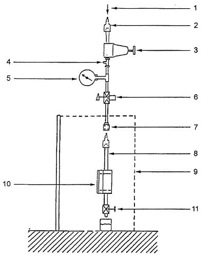 | Chú giải 1 Lỗ nạp không khí hoặc nitơ nén 2 Khớp nối ống dẫn khí 3 Bộ điều áp không khí 4 Vản xả điều chỉnh được 5 Áp kế 6 Van xả ở buồng | 7 Ống nối có ren 8 Ống mềm dẫn không khí bằng cao su với đầu nối được bọc 9 Chụp bảo vệ (xem hình 10) 10 Buồng thử độ thấm 11 Van xả |