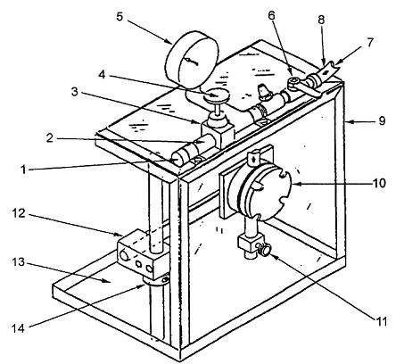 | Chú giải 1 Lỗ nạp không khí hoặc nitơ nén 2 Khớp nối ống dẫn khí 3 Bộ điều áp không khí 4 Vản xả điều chỉnh được 5 Áp kế 6 Van xả ở buồng 7 Ống nối có ren | 8 Ống mềm dẫn không khí bằng cao su với đầu nối được bọc 9 Chụp bảo vệ 10 Buồng thử độ thấm 11 Van xả 12 Kẹp xoay 13 Khay thu chất lỏng 14 Vòng đỡ hai mảnh |
