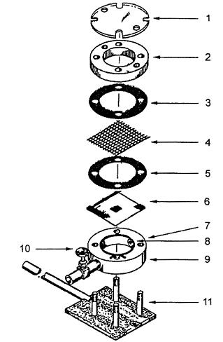 | Chú giải 1 Nắp trong suốt 2 Nắp mặt bích 3 Vòng đệm (mẫu thử dùng ở quy trình B) 4 Lưới đỡ (mẫu thử dùng ở quy trình B) 5 Vòng đệm 6 Mẫu thử | 7 Cửa trên 8 Vật liệu vòng đệm PTFE giãn nở 9 Thân buồng 10 Van xả 11 Giá đỡ buồng |
