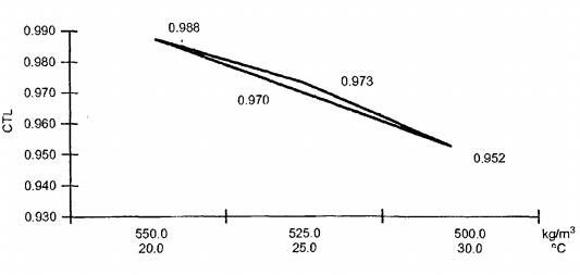 G.3.4 Trong đơn vị thông lệ, trung bình của CTLs xác định cho 68,0 và 86,0 °F qua dải tỷ trọng tương đối gặp trong giao dịch (0,500 đến 0,550) sẽ là 0,972. CTL xác định cho nhiệt độ trung bình 77,0 °F là 0,974; và sự khác biệt lớn nhất là 0,002 hoặc 0,2 %. Độ không đảm bảo này được triển khai qua thể tích giao nhận, sẽ là 0,10 %. Các sự khác biệt trong các kết quả giữa đơn vị mét và đơn vị thông lệ tương ứng với sự khác biệt trong Bảng 54 và Bảng 24. Chú ý rằng tỷ trọng 500,0 kg/m3 là tương quan thực thế với một tỷ trọng tương đối là 0,499.
