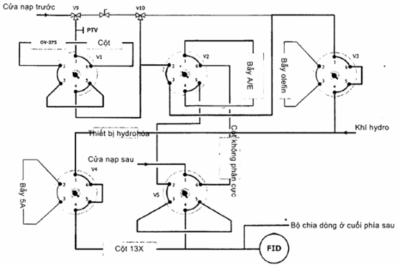 4.1 Mẫu đại diện được đưa vào hệ thống sắc ký khí được điều khiển bằng máy vi tính bao gồm các van chuyển, cột, chất xúc tác hydro hóa olefin, tất cả vận hành ở các nhiệt độ khác nhau. Các van được vận hành tại các thời điểm đã được xác định trước để hướng các phần mẫu vào các cột và bẫy thích hợp. Trong quá trình phân tích, các cột tách các phần mẫu này theo trình tự thành các nhóm của các loại hydrocacbon khác nhau được rửa giải tới detector ion hóa ngọn lửa.