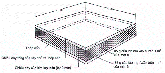 Trên Hình B.1 vẽ biểu diễn một mẫu thép mạ phủ (loại lớp phủ AZ150), hình vuông, diện tích bề mặt là 1 mét vuông. Chiều dày lớp phủ tổng được tính như sau: