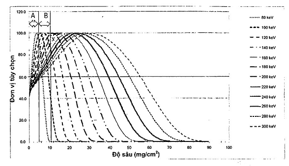 Hình A1.7 - Ví dụ về các phép đo liều phân bố theo độ sâu ở cùng một thiết bị chiếu xạ chùm tia điện tử nhưng ở các năng lượng chùm tia khác nhau