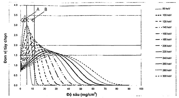 A1.4.1 Đồ thị phân bố liều theo độ sâu điển hình đối với các điện tử năng lượng thấp được nêu trong Hình A1.4 và Hình A1.5.