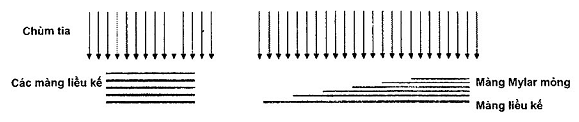 Bên phải: màng liều kế dưới các lớp màng mỏng chất dẻo (Mylar) tăng dần