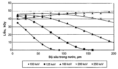 Hình A1.5 - Sự phân bố liều theo độ sâu đo được trong nước (khối lượng riêng 1 g/cm3)