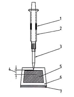 5.1.2 Micro pipet tự động, có đầu pipet dùng một lần, được gắn vào khung đỡ, để nhỏ giọt (0,100 ± 0,002) ml chất lỏng đối với mức độ nhiễm thấp và (0,200 ± 0,004) ml đối với mức độ nhiễm cao (xem Hình 1)