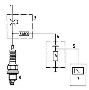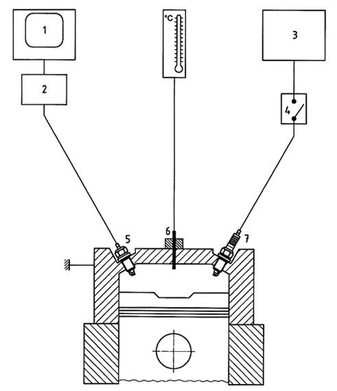 Sử dụng kỹ thuật đo như nhau về đánh lửa sớm cho mỗi động cơ. Dòng ion sinh ra trước khi đánh lửa được phát hiện bằng cách tác động một điện áp âm 350 V vào điện cực giữa của bugi của xy lanh được thử với mạch điện như đã nêu trên Hình E.3. Hình E.4 giới thiệu sự phát hiện đánh lửa sớm. Để giảm tới mức tối thiểu các sai số, điện áp tác dụng được ngắt ngay sau khi đánh lửa.