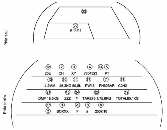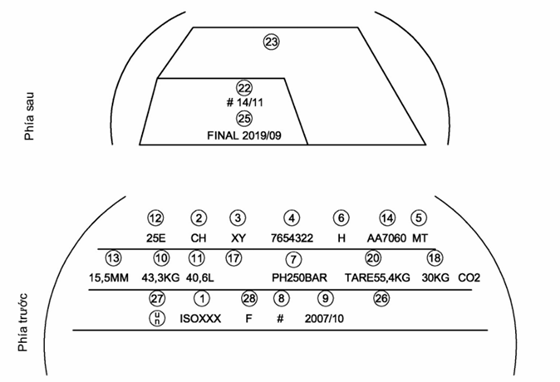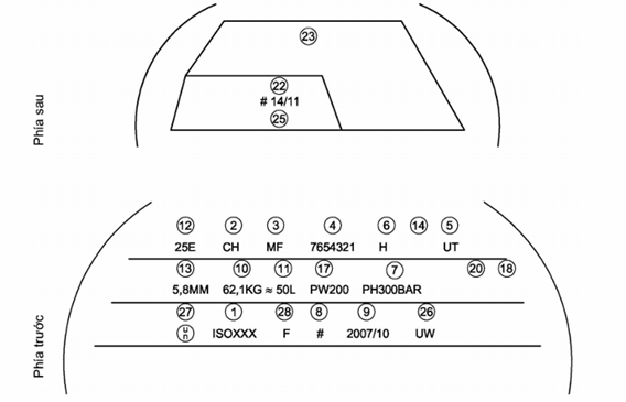 | 7 Áp suất thử (PH 60 BAR hoặc PH 52 BAR) a | 22 Nhãn kiểm tra và ngày kiểm tra định kỳ (năm/tháng) |