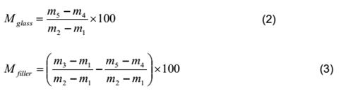 Đối với từng mẫu thử, tính hàm lượng sợi thủy tinh Mglassvà hàm lượng chất độn, Mfiller, biểu thị bằng phần trăm khối lượng ban đầu, tương ứng theo công thức (2) và (3):