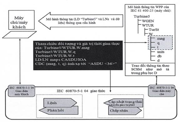 Trao đổi thông tin giữa thiết bị nhà máy điện gió (WPP) và hệ thống giám sát và điều khiển chủ yếu bao gồm - theo Hình G.1 - một máy khách, một máy chủ, một số giao diện và hành động.